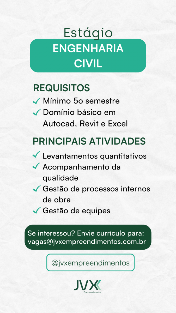 Enviado em qui, 17/07/2025 - 13:53 A carga horária é de 30h/semanais, organizada de acordo com grade curricular do aluno. Bolsa estágio é de R$ 1.500,00 (incluindo transporte). A vaga é para trabalhar no campo, na obra de um empreendimento residencial de 20 pavimentos em Jaguaribe.